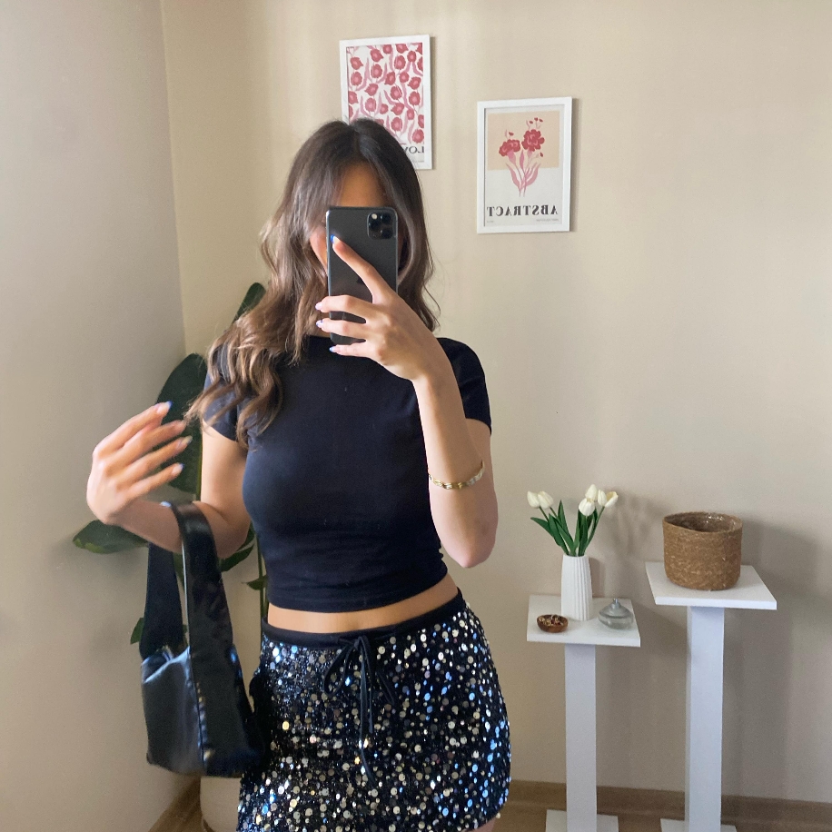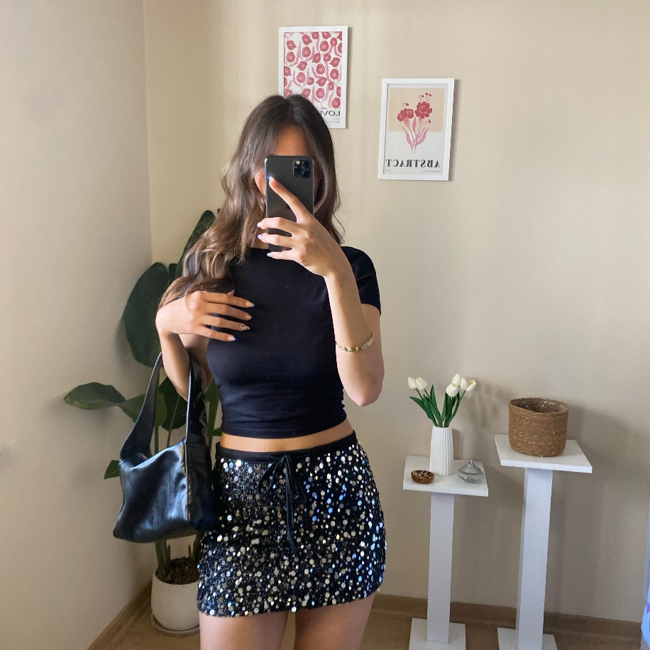 Gece kombinlerinde ışığın başrolü siz olun! Bu siyah mini etek, tamamı parlak payetlerle kaplı yüzeyi sayesinde her adımda göz alıcı bir ışıltı sunar. Mini kesimiyle şık ve iddialı bir duruş kazandırır. Crop üstler, blazer ceketler veya sade tişörtlerle kolayca kombinlenerek tarzınızı öne çıkarır.