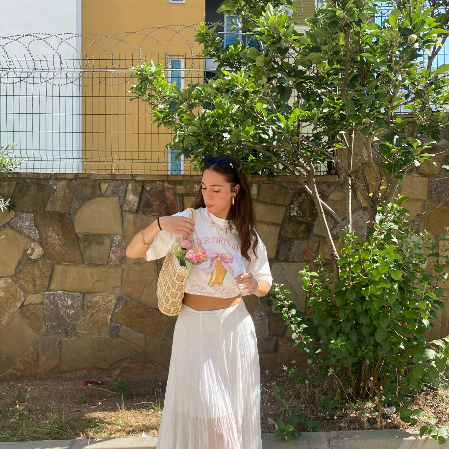Yaz stilinize zarif bir dokunuş: Bu beyaz şifon etek, pileli yapısıyla hareketli ve feminen bir silüet sunar. Astarlı tasarımı sayesinde iç göstermeyen rahat bir kullanım sağlar. Günlük kombinlerden sahil yürüyüşlerine, şehir stilinden tatil valizine kadar her ortamda keyifle kullanabileceğiniz, gardırobun kurtarıcı parçalarından biri.